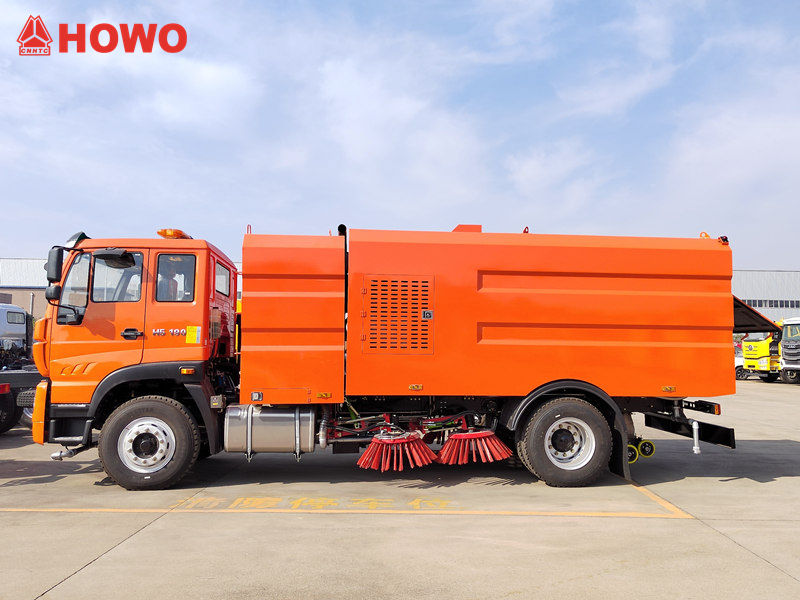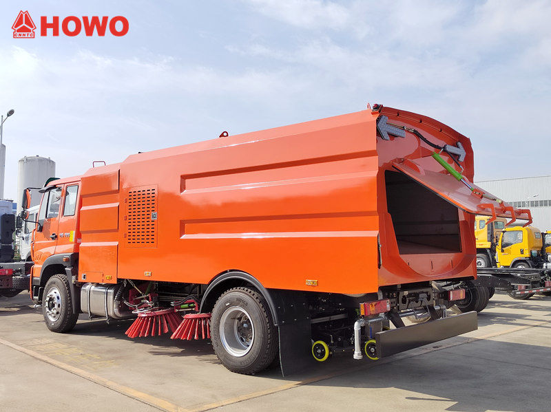De Sinotruk-wegreinigingswagen combineert veegschijven met een vacuümzuigsysteem om wegvuil snel in een container te verzamelen. Dankzij een watersproeisysteem wordt stofvorming tijdens het gebruik effectief verminderd, wat zorgt voor milieuvriendelijke resultaten. De truck maakt gebruik van een hydraulisch besturingssysteem waarmee de positie van de veegschijf en de zuigmond flexibel kan worden aangepast aan wisselende wegomstandigheden.