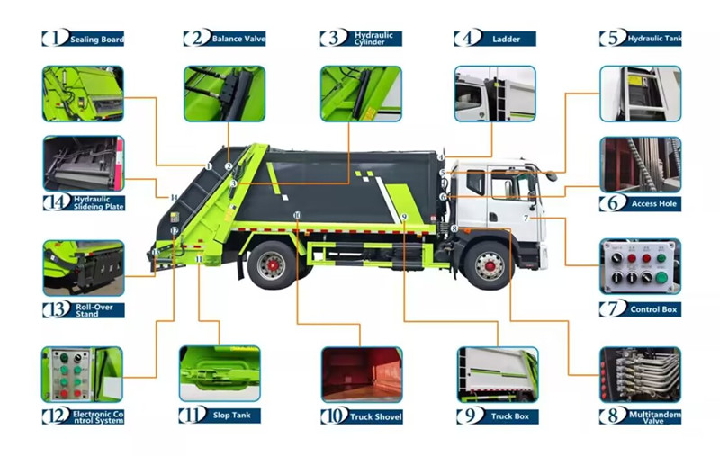●De 10m³ achterlader-verdichter bestaat hoofdzakelijk uit een afvalcontainer, lader, compressie-duwplaat, hydraulisch systeem, elektronisch besturingssysteem en achterklep.