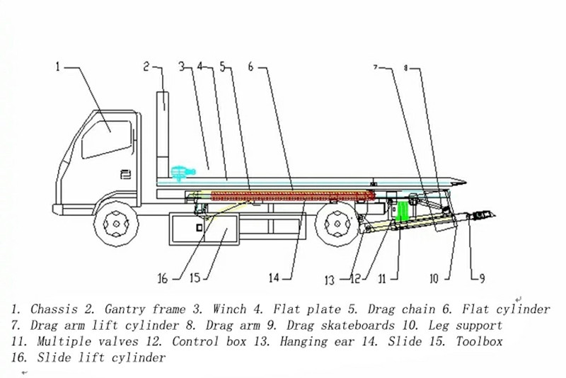 ●De opbouw van een bergingswagen met laadplatform bestaat hoofdzakelijk uit een steunarm, laadplatform, lier, hydraulisch systeem, hulpsteunen en bedieningsapparatuur.