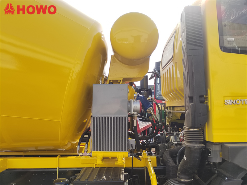 De HOWO betonmixer met een inhoud van 5 kubieke meter is gebaseerd op de HOWO 2080 cabine met een totaalgewicht van 16 ton en een wielbasis van 3800 mm. Hij is uitgerust met een SINOTRUK MC05.18-40 motor van 180 pk en een HW90510C 10-versnellingsbak. De bovenste mengtank heeft een inhoud van 5 kubieke meter en is gemaakt van Q355 mangaanstaal. De tankwand is 4 mm dik en de bodem 6 mm. De mixer is voorzien van een reductiekast, hydraulische pomp en motor, radiator, luchtregelunit, een watertank met een inhoud van 400 liter, persluchttoevoer, dubbelzijdige bedieningshendels aan de achterzijde, hefinrichting en een laag residupercentage.