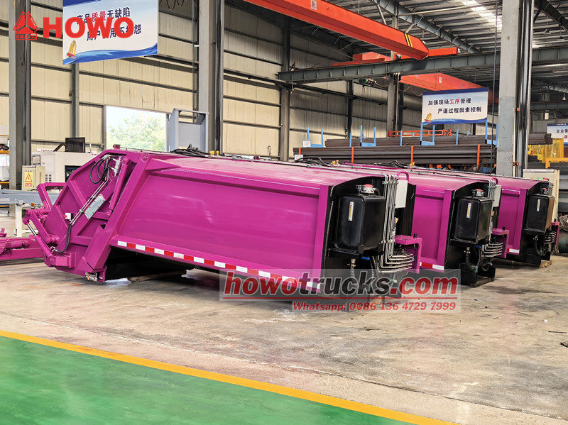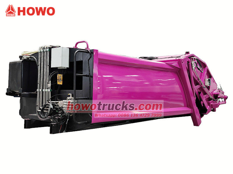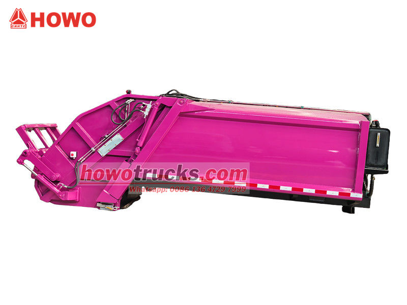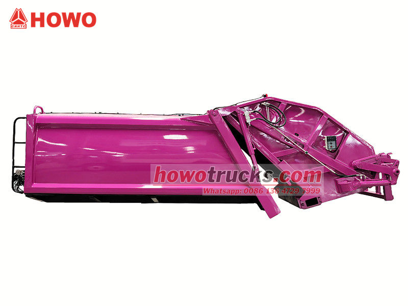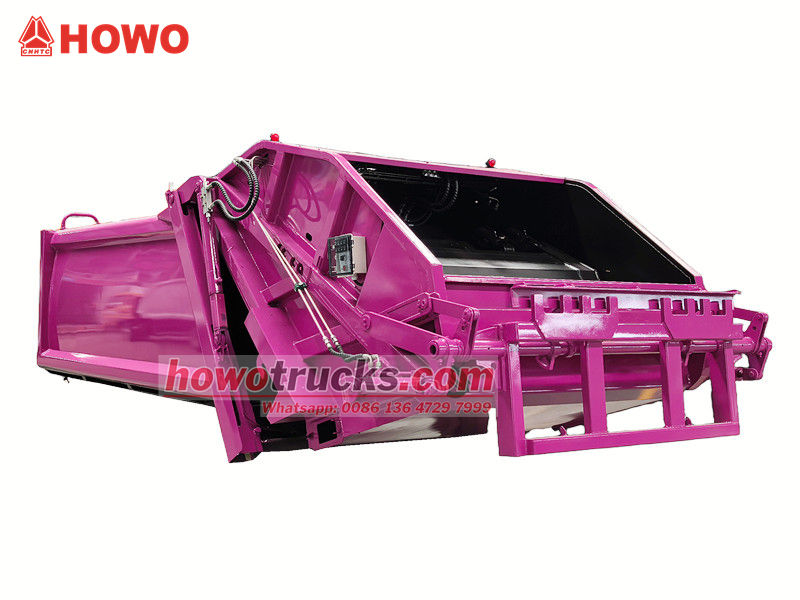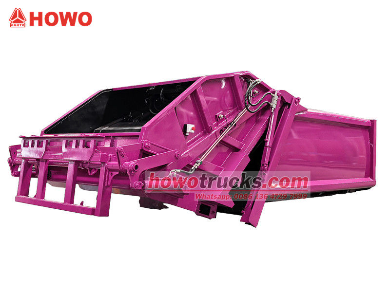 Howo 8 m³ verdichtingsvrachtwagenopbouw (ook wel achterlader verdichtingsvrachtwagen bovenbouw, 8 m³ vuilnisverdichtingsvrachtwagen bovenbouw kit, vuilnisverdichtingsvrachtwagenopbouw, afvalverdichtingsvrachtwagen bovenbouw kit, achterlader afvalinzamelingsvrachtwagen kit, enz. genoemd). Het bovenste gedeelte is een vuilnisbak van 8 m³, de achterkant heeft een kantelmechanisme voor de bak. Er zijn 3 manieren om de vrachtwagen te laden en te lossen.