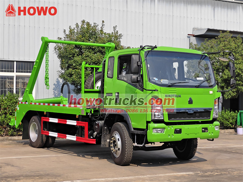 8000De HOWO 8CBM RHD Skip Bin Loader is een zeer efficiënte en praktische afvaltransportmachine. Het voertuig is gebouwd op een HOWO 4x2 chassis met het stuur aan de rechterkant, aangedreven door een 160 pk sterke YC4E160-33 dieselmotor die voldoet aan de Euro III-emissienorm, en kan een topsnelheid van 90 km/u bereiken. De opbouw bestaat uit een afvalbak van 8 kubieke meter, gemaakt van 4 mm dik koolstofstaal, in combinatie met een zwenkarmsysteem dat wordt aangedreven door twee hydraulische cilinders, wat een hefvermogen van meer dan 6 ton oplevert. Dit hydraulische systeem werkt met een werkdruk van 18 MPa, waardoor een laadcyclus in slechts 20-25 seconden en een loscyclus in 30 seconden wordt voltooid, wat een uitstekende operationele efficiëntie aantoont.