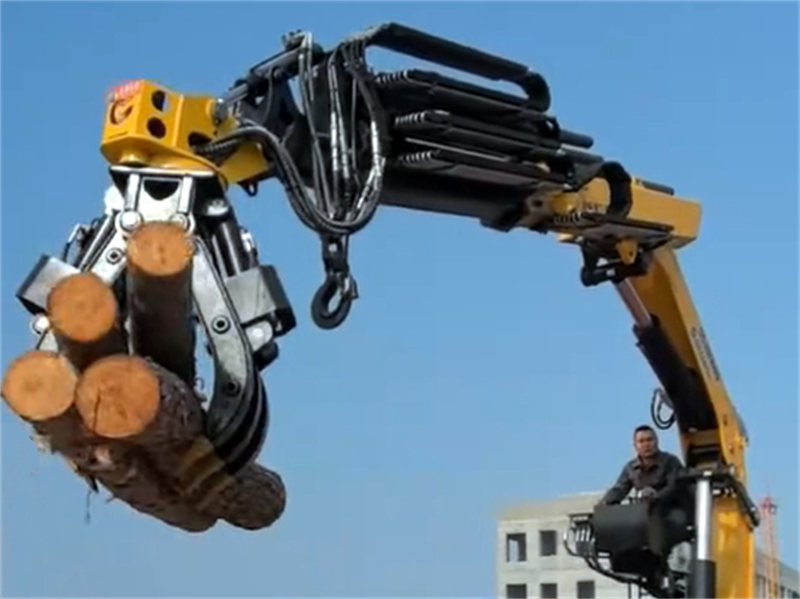 De kraan is uitgerust met een grijper, waardoor hij veelzijdiger is in het hanteren van verschillende soorten materialen. Of het nu gaat om hout, schroot of andere materialen, de grijper kan ze efficiënt tillen, transporteren en lossen.
