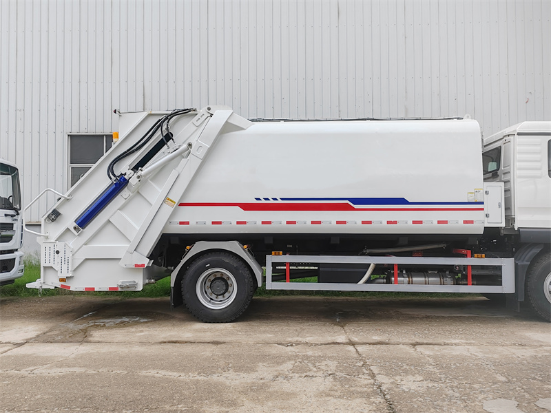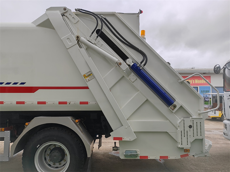 DeHOWO 4x2 vuilniswagen met een inhoud van 16 m³ en een verdichtingsinstallatie Het systeem maakt gebruik van een bidirectionele compactortechnologie met achterlading, waardoor een zeer efficiënte coördinatie tussen afvalinzameling en -verdichting mogelijk is. Tijdens de werking wordt afval via de achtervuller in de container geladen. Nadat de vuller sluit, daalt de schuifplaat en werkt deze samen met de schraperplaat om een eerste, krachtige verdichting uit te voeren. De schraperplaat draait vervolgens naar voren om het afval verder te verdichten, op te tillen en in de container te duwen. Tegelijkertijd trekt de duwplaat zich onder druk terug, waardoor een bidirectioneel compressie-effect ontstaat dat de laadcapaciteit vergroot. Nadat de schraperplaat zich heeft teruggetrokken, kan er extra afval worden geladen en herhaalt de cyclus zich. Door meerdere cycli van horizontale compressie en verdichting in de container wordt het afvalvolume aanzienlijk verminderd.