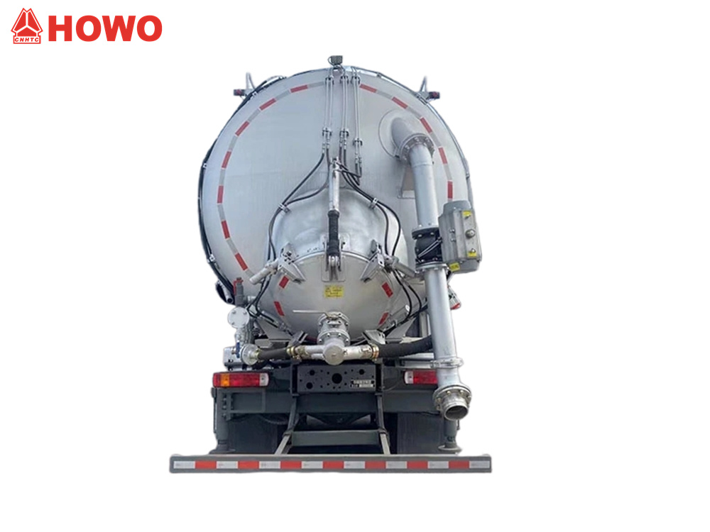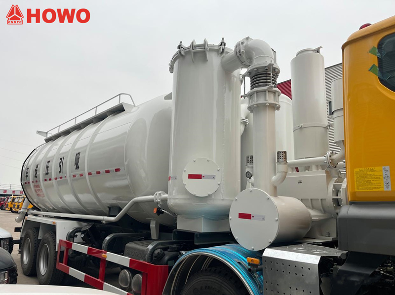 De HOWO 8x4 25 m³ zuig- en persbandtransporteur is een aangepaste versie van het HOWO TX350 8x4 chassis, met een grote wielbasis van 1800+4600+1350 mm. Hij is uitgerust met een Sinotruk MC07H.35-60 motor en een HW15710L versnellingsbak. De bovenbouw is volledig voorzien van zakkenfilters en de achterzijde is een opslagtank. De transporteur is uitgerust met hydraulische steunpoten, ventilatoren, externe luchttoevoerleidingen, vacuümpompen, luchtcompressoren, hefcilinders, filtersystemen, zuig- en persleidingsystemen, elektronische regelkasten, enz. De vacuümpomp werkt met onderdrukzuiging en de luchtcompressor met overdrukpers.