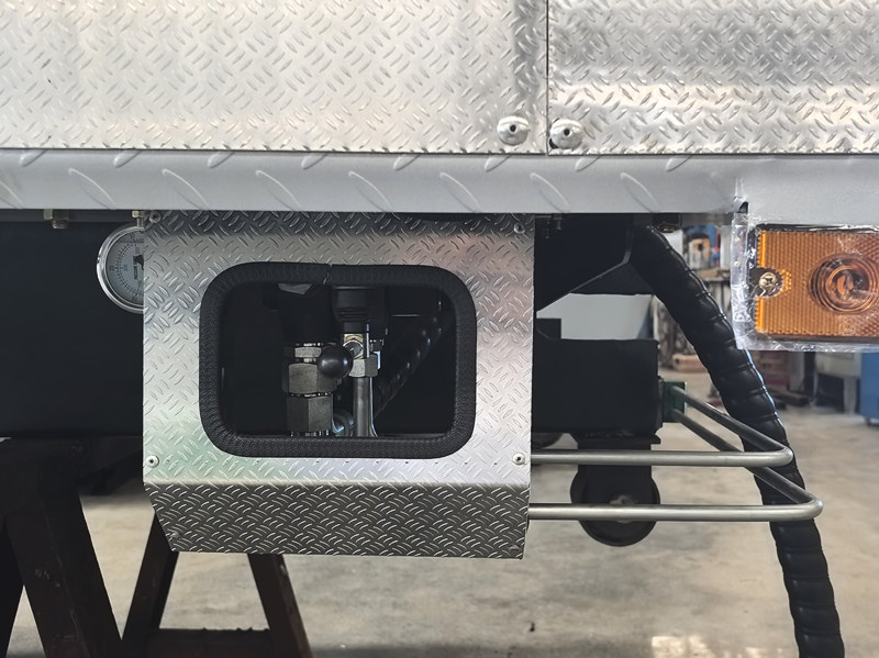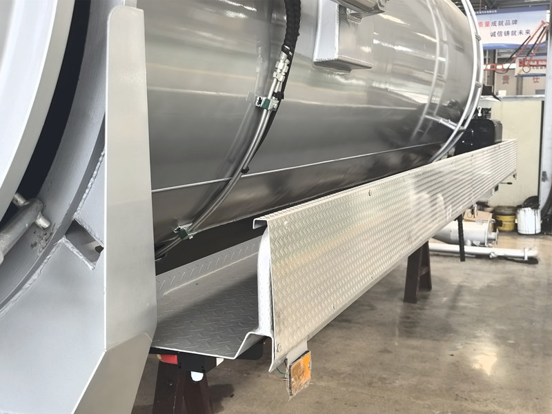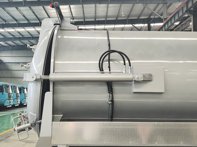 ●Het voertuig is uitgerust met een hydraulisch kiepsysteem dat de gehele tank kantelt voor een grondige lediging en spoeling, waardoor resten worden verminderd en het interieur schoon blijft. Het gehele proces is afgesloten, waardoor secundaire verontreiniging en geurverspreiding worden voorkomen en een schone en hygiënische werkomgeving wordt gegarandeerd.