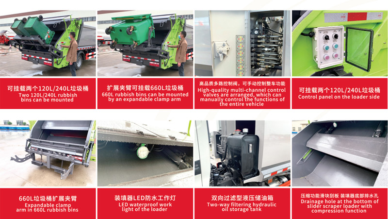 ●Hoogrendementscompressie: Door gebruik te maken van een geavanceerd hydraulisch compressiesysteem wordt het afvalvolume aanzienlijk verminderd, waardoor de transportefficiëntie verbetert.