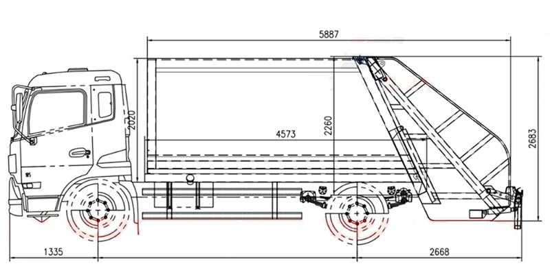 ●Het voertuig is aan de achterzijde voorzien van een kantelmechanisme dat de afvalbakken of -trechters automatisch kantelt, waardoor het afval in de perskamer terechtkomt. Hydraulische duwers comprimeren het afval meerdere malen, waardoor het volume wordt teruggebracht tot ongeveer een derde van het oorspronkelijke formaat, wat de laadcapaciteit aanzienlijk verhoogt.